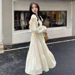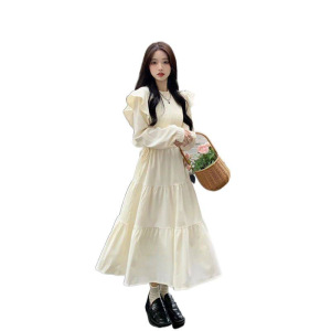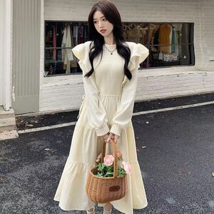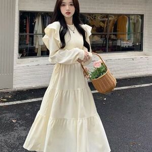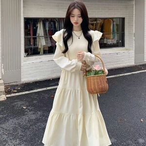 温柔风针织拼接荷叶边长袖连衣裙女秋冬法式甜美收腰显瘦气质长裙
