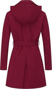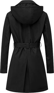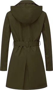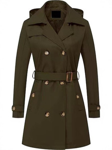 欧美2025时尚风衣双排扣经典翻领外套腰带修身女外套带可拆卸兜帽