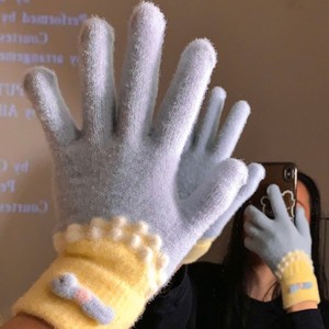 蓝色毛绒针织五指手套女秋冬季保暖可爱加绒加厚骑车防寒2025新款