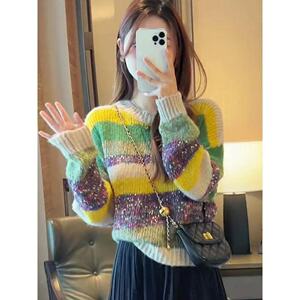 彩虹色条纹减龄毛衣女套头2025秋冬季新款撞色软糯慵懒宽松针织衫