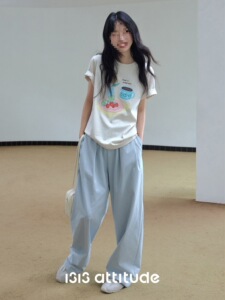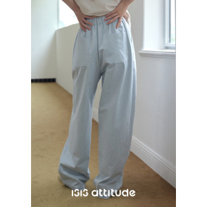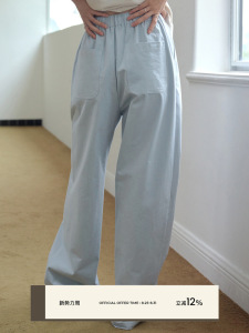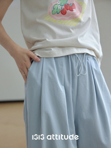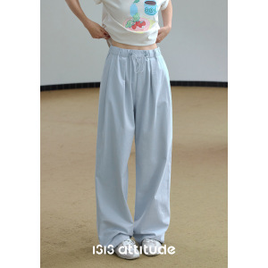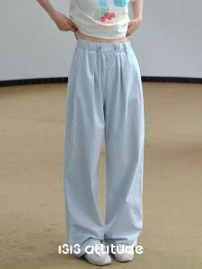 【现货】1313海军风浅蓝色抽绳松紧高腰薄休闲裤宽松阔腿直筒长裤