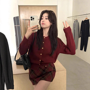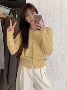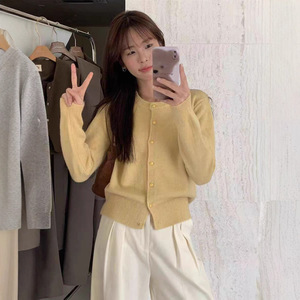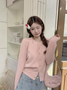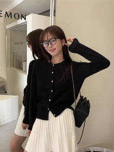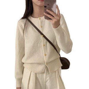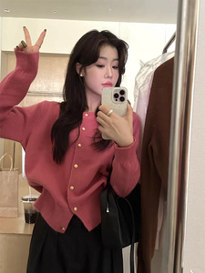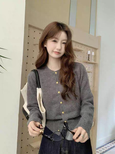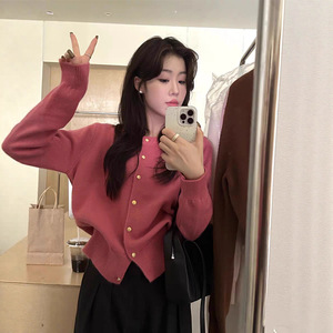 韩系小众别致金扣设计感圆领针织开衫女秋季新款多色软糯毛衣外套