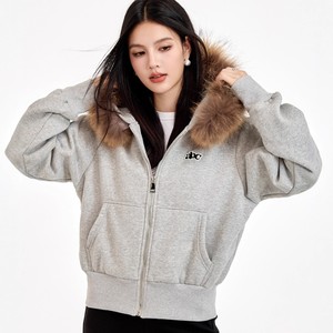 G1868连帽毛领可拆卸蓬松貉子毛宽松韩系贴布绣拉链卫衣上衣秋冬