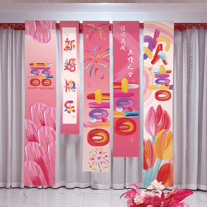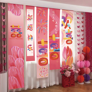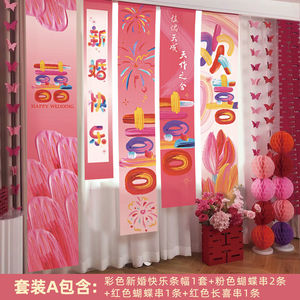 结婚挂布七彩粉喜字条幅婚房布置卧室蝴蝶长喜字晨袍拍照背景装饰
