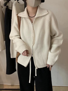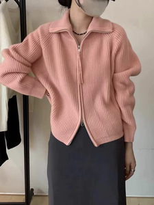 气质立领坑条双拉链针织开衫外套秋冬新款时尚百搭纯色毛衣上衣女