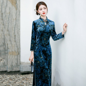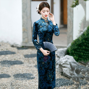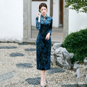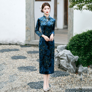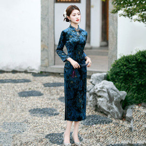 水滴领蓝色丝绒国风中式妈妈秋季长袖旗袍2025新款女复古修身春秋