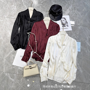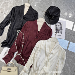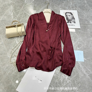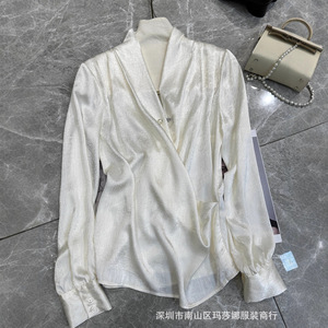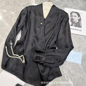 法式V领衬衫25早秋新款气质不规则长袖缎面百搭纯色女衬衫上衣三