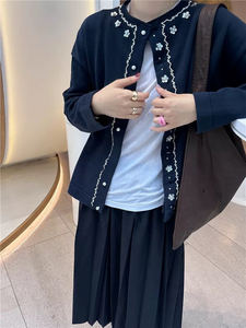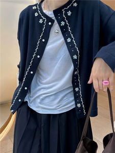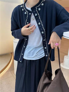 静谧藏青 2025早秋新品 轻奢小众 棉纱手工钉珠针织开衫