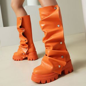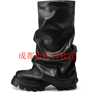 女式折叠靴休闲靴宽小腿褶皱防水台靴红色中高靴子厚实叠层靴大码