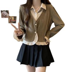 大码女装韩版单排扣边长袖T恤女春秋季新款宽松显瘦百搭时尚上衣