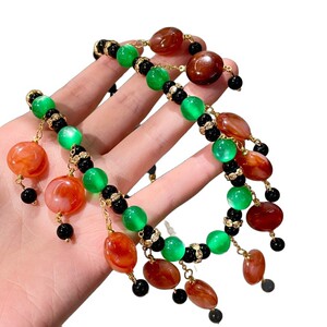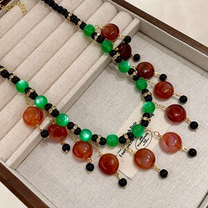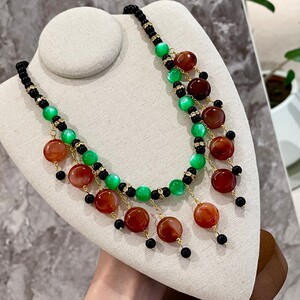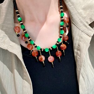 中古vintage波西米亚民族风水晶串珠颈链绿色猫眼石项链女锁骨链