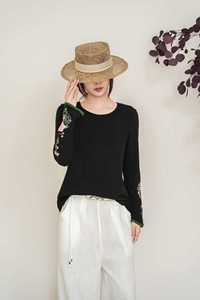 2025秋款纯色针织棉混女士国风内搭圆领长袖刺绣女民族风打底衫