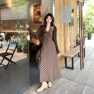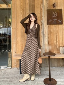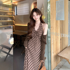 美拉德挂脖格子吊带连衣裙女2025秋季新款系带设计感收腰显瘦长裙