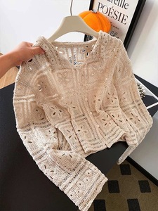 广州十三行高货爆款~2025秋季新款翻领慵懒风长袖镂空针织衫上衣