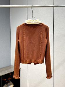 深圳南油设计感假两件钉珠花边翻领长袖焦糖色针织开衫女2025秋款