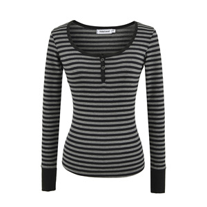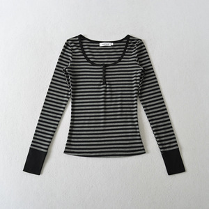 秋冬新款深灰色条纹三粒扣长袖T恤女美式复古圆领打底衫上衣