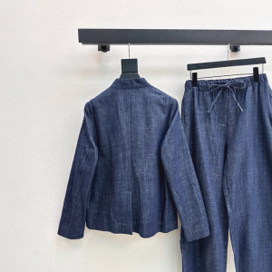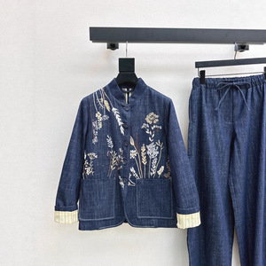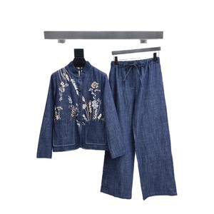 气质优雅风温柔长袖设计感刺绣休闲外套松紧腰直筒裤显瘦高挑套装