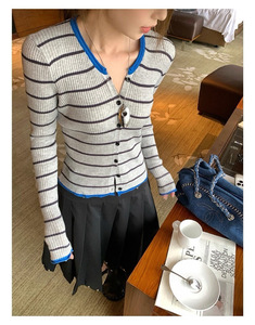 半岛早秋 韩系撞色条纹针织衫女早秋修身短款气质开衫上衣