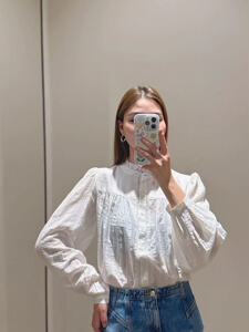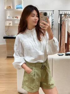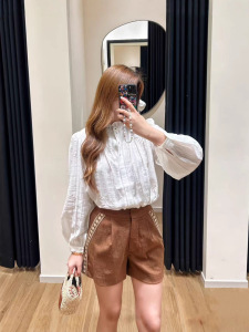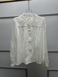 南油高版本批发法式上衣复古灯笼袖格纹提花刺绣木耳边气质白衬衫