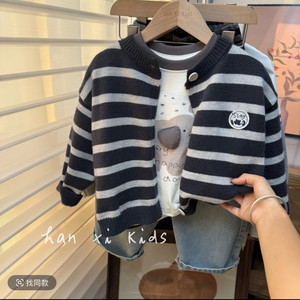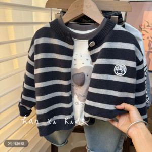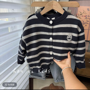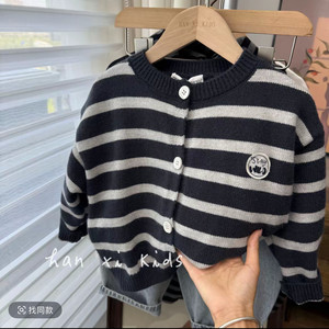 儿童灰色毛衣韩国男女童洋气条纹毛衣开衫儿童百搭圆领外套针织衫
