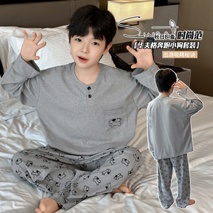 男童春秋季睡衣儿童长袖小男孩大童中学生华夫格家居服套装新款