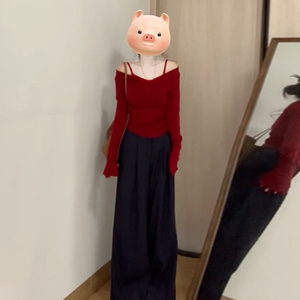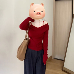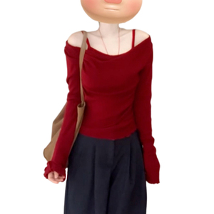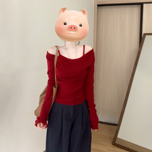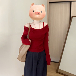 复古红色设计感假两件长袖t恤女秋季2025新款法式一字肩针织上衣