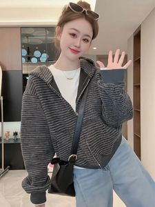 慵懒连帽卫衣女春秋新款韩系拉链条纹开衫百搭显瘦休闲减龄短外套