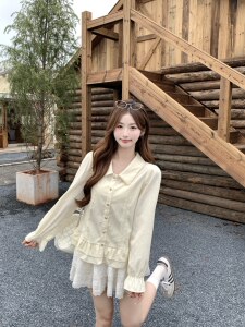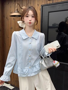 法式娃娃衫泡泡袖蕾丝长袖衬衫女秋装大码胖mm显瘦荷叶边雪纺上衣