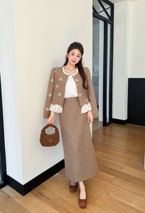 深圳南油秋季荷叶边撞色小香风刺绣毛呢外套中长款半裙两件套