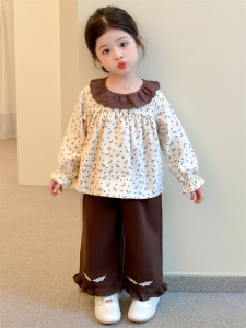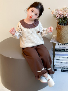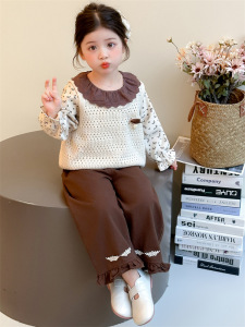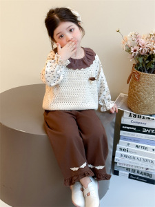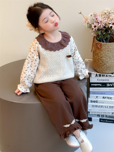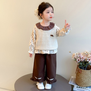 女童春秋套装2025新款韩版针织马甲波点上衣绣花阔腿裤三件套潮