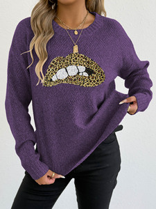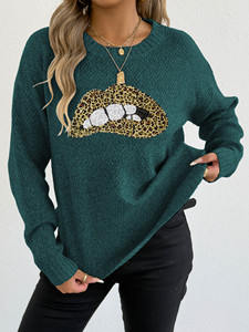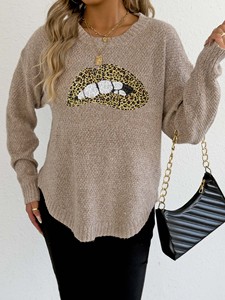 欧美外贸女装跨境平台现货豹纹刺绣亮片嘴唇个性圆领套头毛衣女