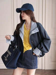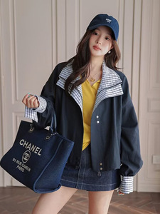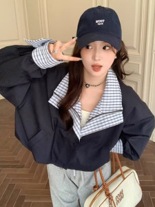 美式复古格子假两件外套女春秋新款宽松慵懒风工装休闲夹克上衣女