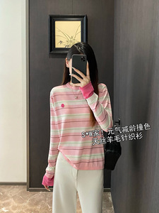 笑脸刺绣 天丝羊毛彩色条纹针织T恤上衣长袖内搭打底衫女L4065M