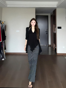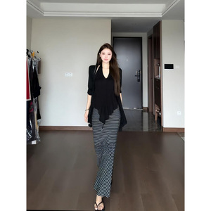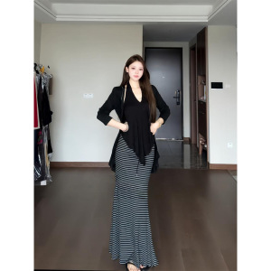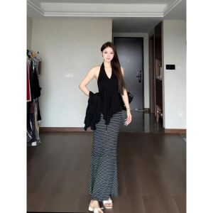 氛围美神纯欲风挂脖吊带开衫上衣鱼尾条纹半身裙三件套
