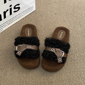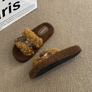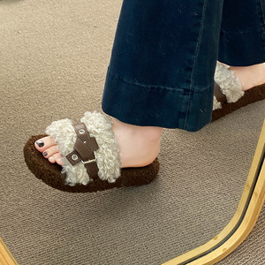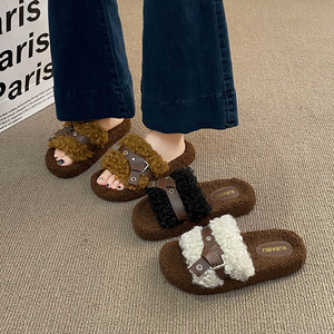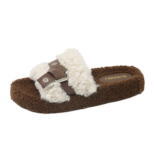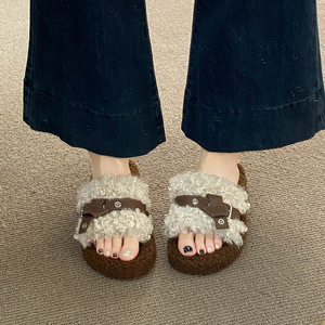 松糕毛毛拖鞋女外穿秋冬新款小个子厚底百搭皮带扣一字拖保暖棉拖