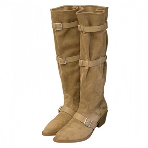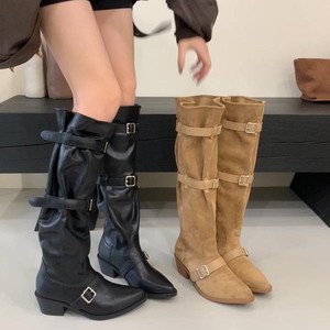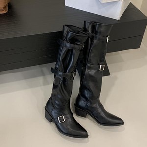 尖头牛仔靴女高筒靴2025秋季新款两穿粗跟显瘦堆堆靴皮带扣长筒靴