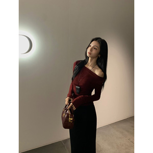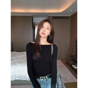 MULVAN 一字肩长袖T恤女修身气质短款甜辣小心机露肩针织上衣