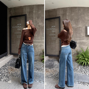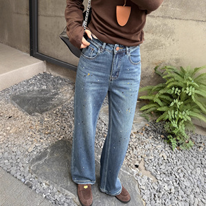 版型颜值在线~明星同款漆点窄版牛仔裤女秋季直筒宽松拖地阔腿裤