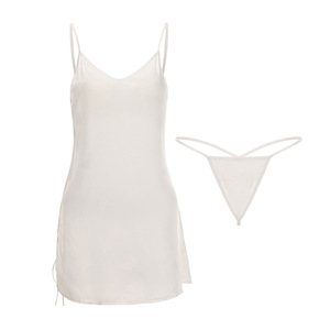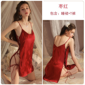 瑰若女士慵懒印花冰丝睡衣激情火辣绑带开衩加胸垫吊带裙套装5616