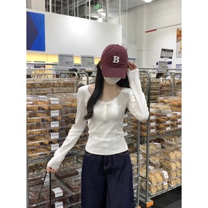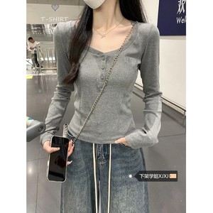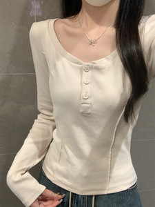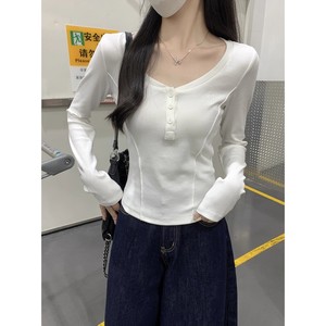 2025秋圆领纽扣修身鱼骨掐腰显瘦设计感长袖内搭T恤女 打底衫上衣