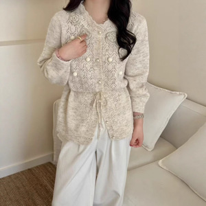 法式花朵长袖针织外套女秋装镂空马海毛上衣开衫辣妹绑带女装毛衣
