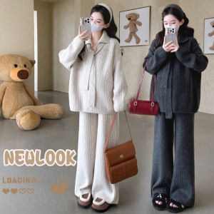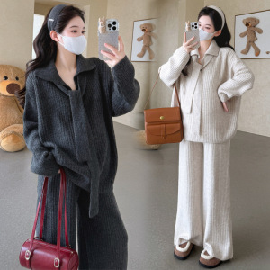 2025秋冬新款高品质翻领领巾学院风宽松毛衣阔腿裤显瘦孕妇套装女