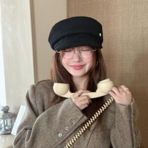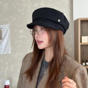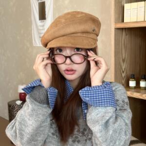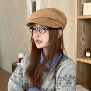 秋冬韩国时髦M标复古绒面咖啡色显脸小百搭平顶文艺画家帽子女潮