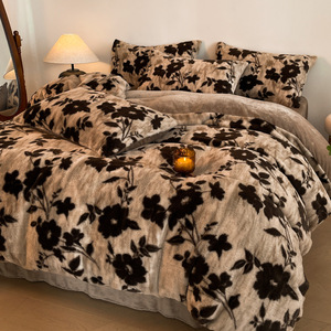 豹纹兔毛绒雕花牛奶绒四件套加厚保暖珊瑚绒被套双面法兰绒床单冬
