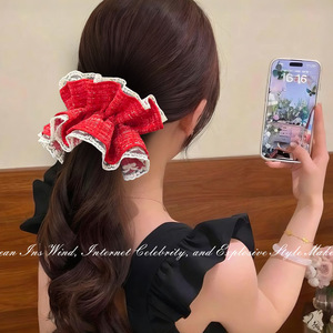 秋季新款上新甜美小香风红色毛呢大肠发圈氛围感圣诞新年发饰头饰