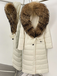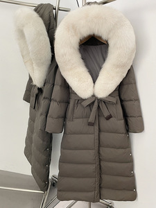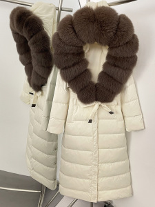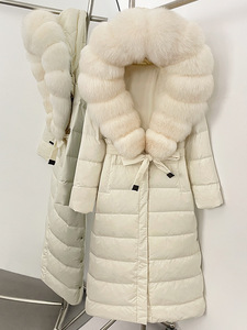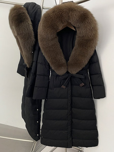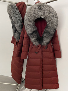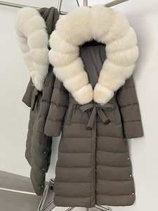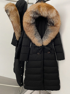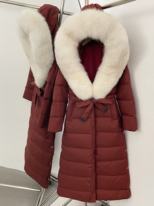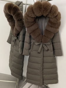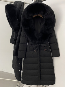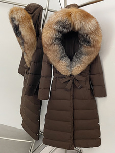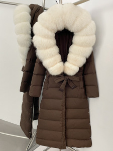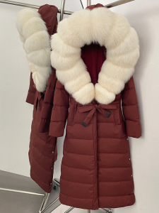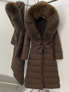 2025新款平胡跨境狐狸毛领连帽羽绒服女长款过膝系带收腰显瘦外套