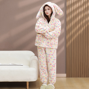 2025新款秋冬季珊瑚绒睡衣女冬天加绒加厚彩色波点法兰绒家居服