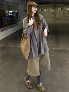 早秋季灰色中长款宽松长袖T恤女2025新款韩系慵懒松弛感穿搭上衣