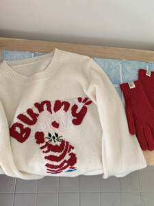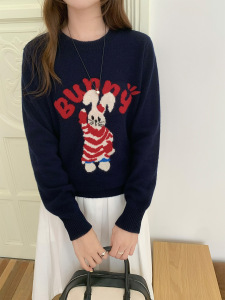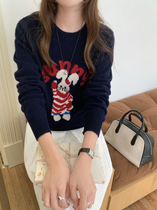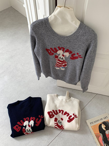 新款秋冬纯羊毛衫女圆领可爱卡通提花小兔兔针织打底宽松简约毛衣