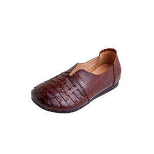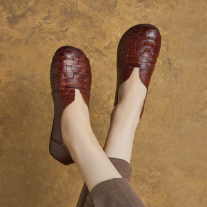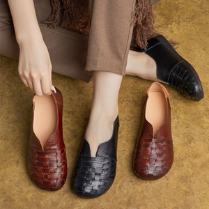 2025秋季新款民族风真皮圆头手工编织软底女鞋平底单鞋一脚蹬女鞋